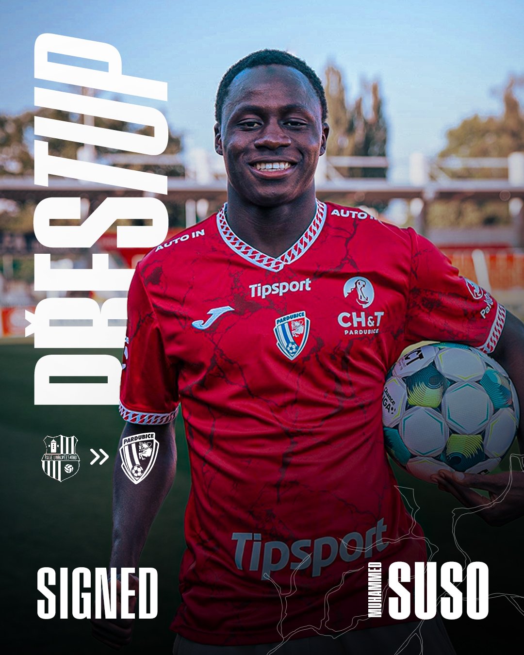 Do Pardubic přestupuje 19letý gambijský útočník Muhammed Suso. „Jsem opravdu šťastný, že mohu být v Pardubicích. Lidé, které jsem v kubu zatím potkal, jsou velice milí. Moc se těším na to, až se poprvé setkám s fanoušky. Je to pro mě další krok v mé fotbalové kariéře a děkuji všem, kteří mi v mé cestě pomáhají,“ hlásí po svém příchodu Suso.